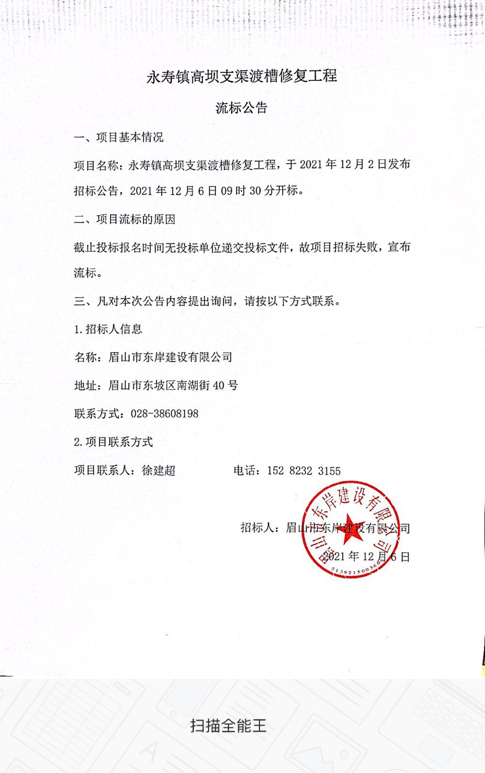 永寿镇高坝支渠渡槽修复工程流标公告