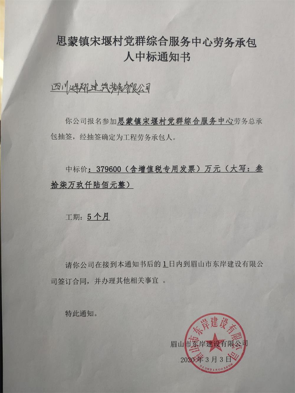 关于思蒙镇宋堰村党群综合服务中心和土地乡花桥村党群综合服务中心中标通知