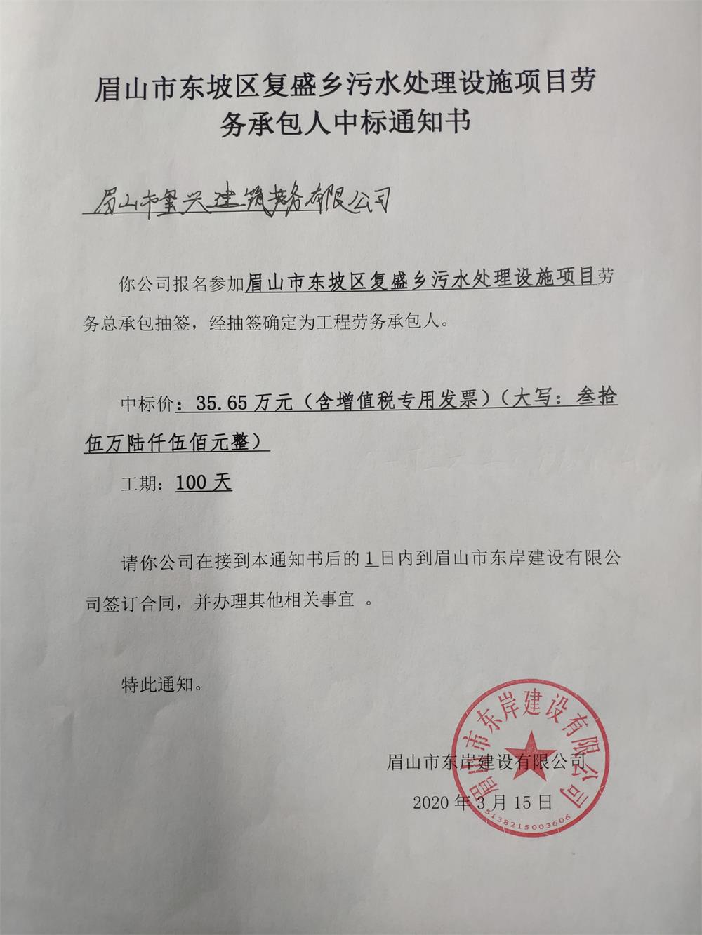 眉山市东坡区复盛乡污水处理设施项目中标通知