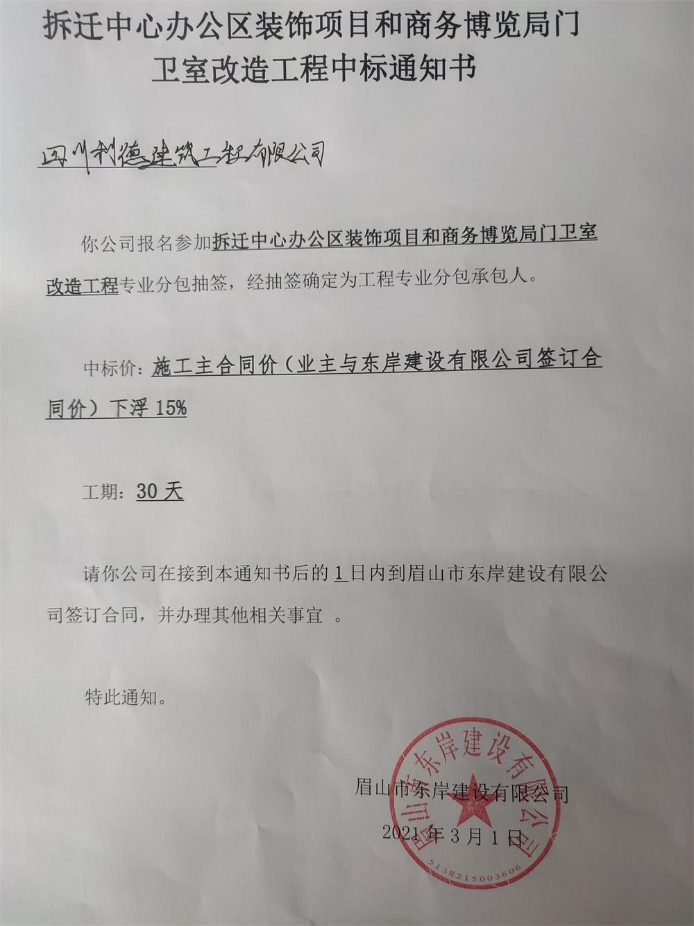 拆迁办办公室、商务局门卫改造、洞子口中标通知