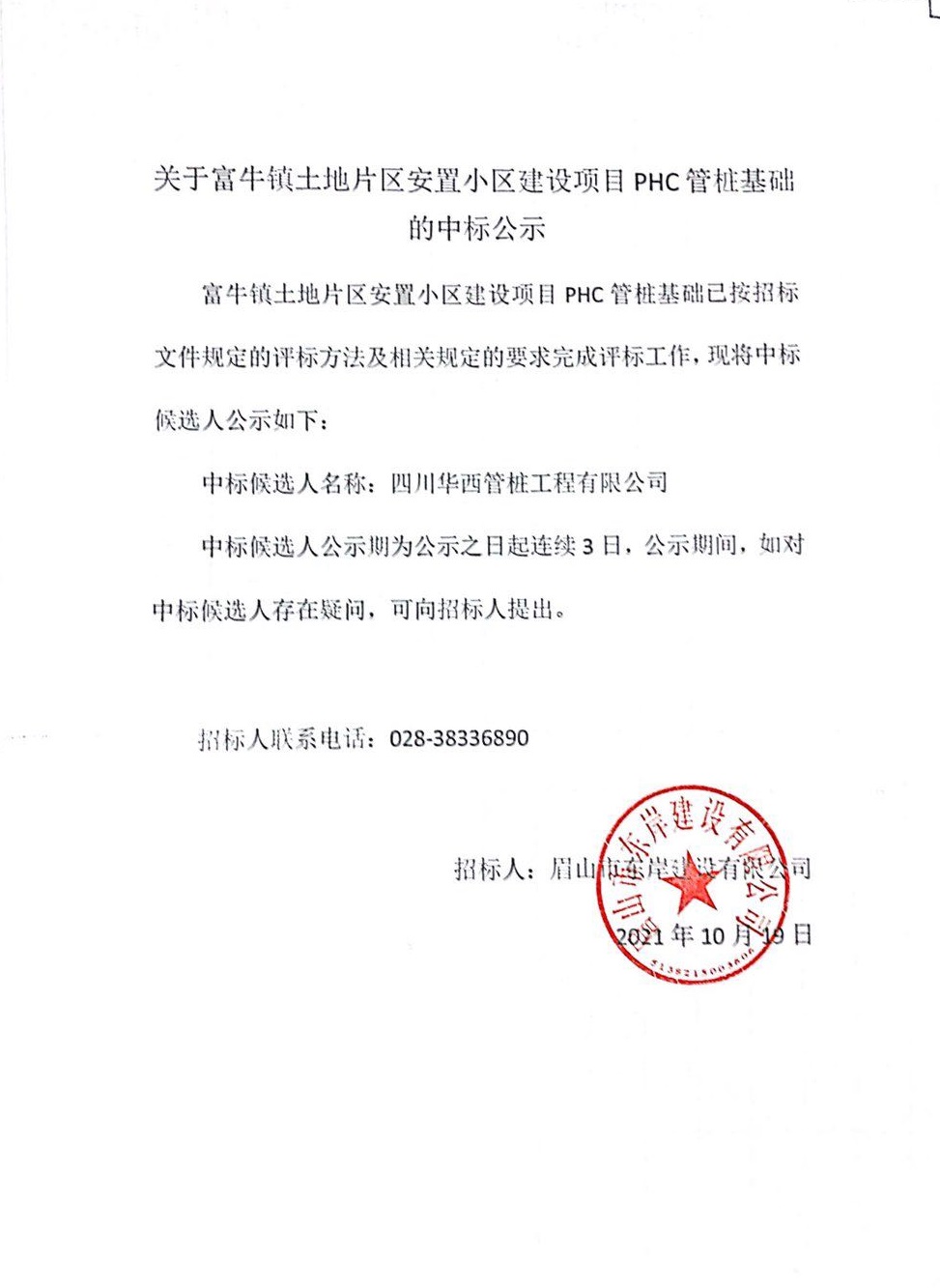 富牛镇土地片区安置小区建设项目PHC管桩基础项目中标公示