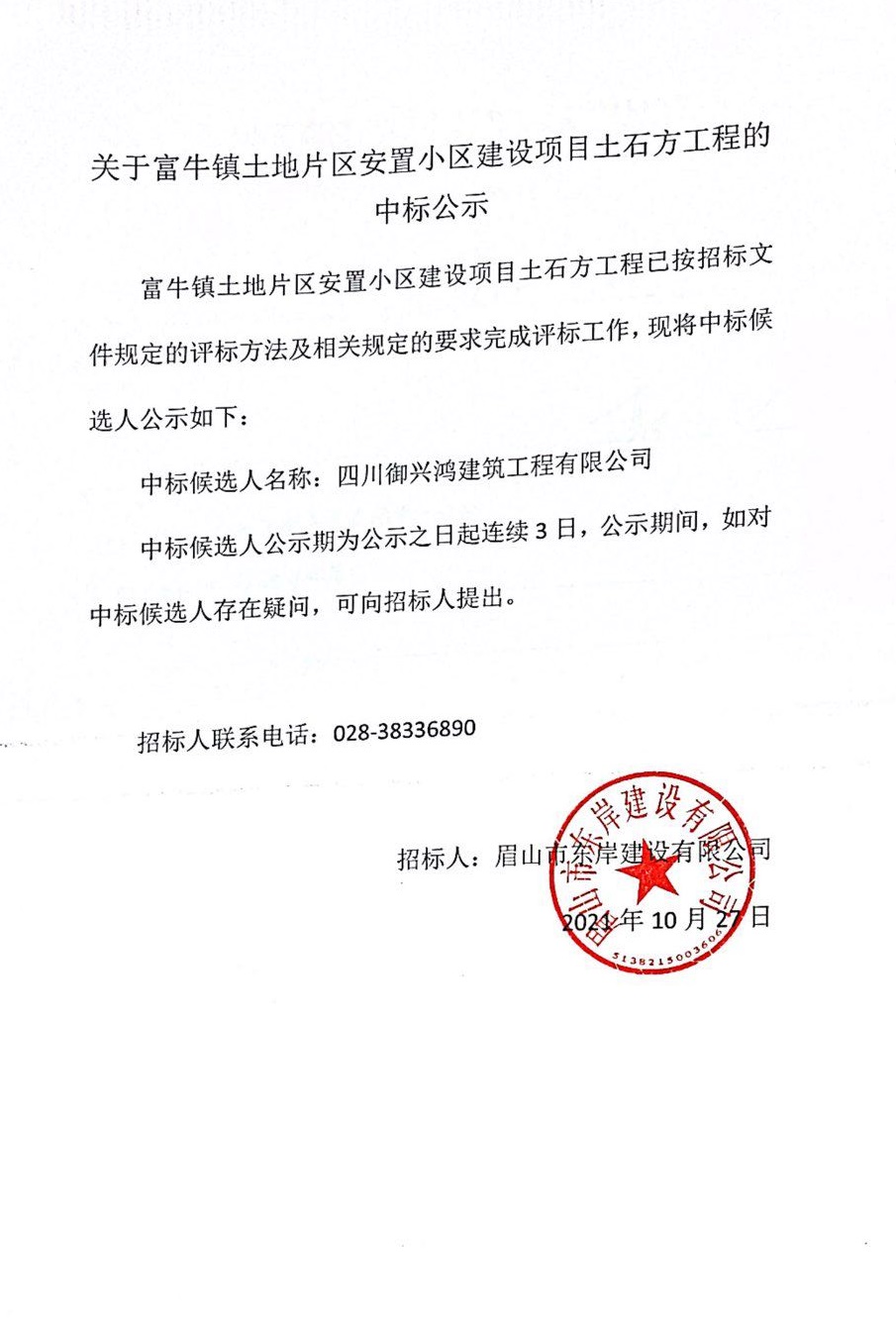 关于富牛镇土地片区安置小区建设项目土石方工程的中标公示